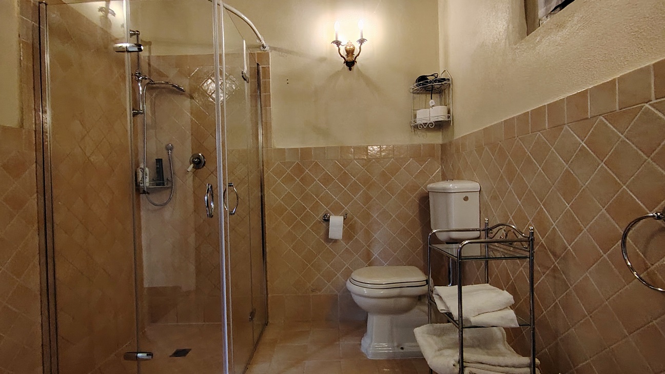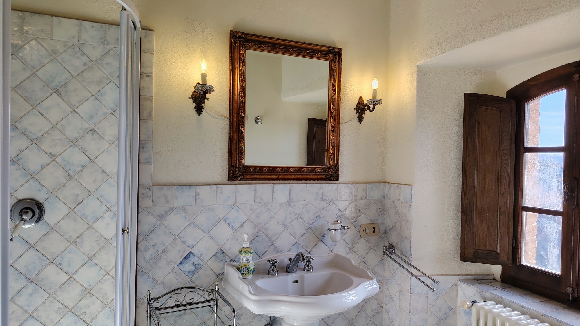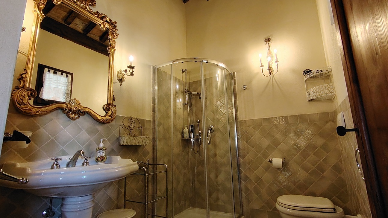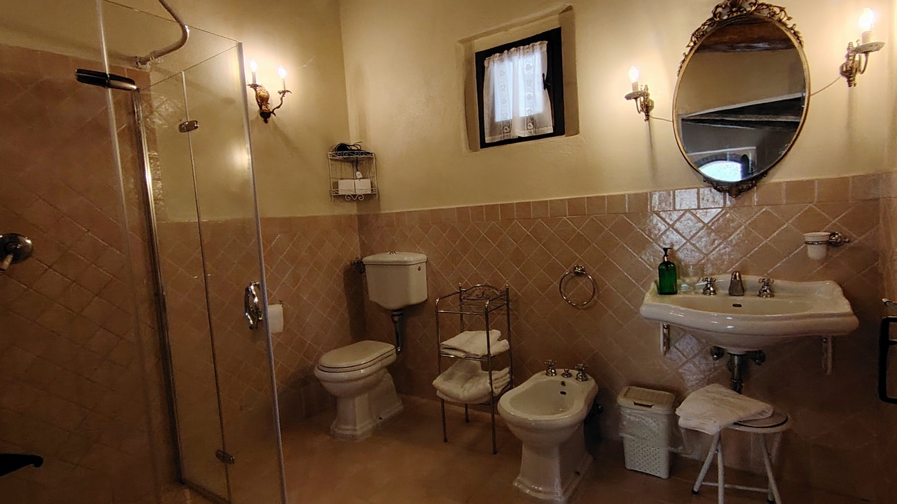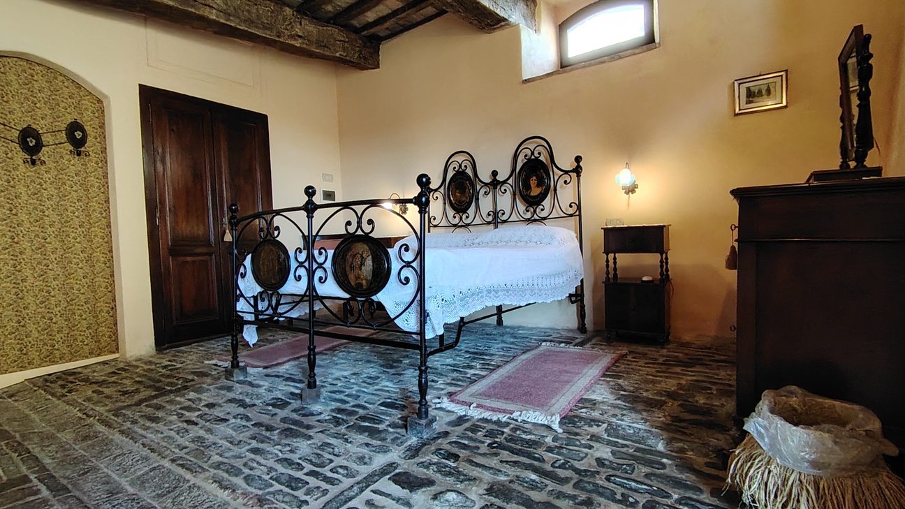 Dimora delle Fosse, ampia camera matrimoniale i cui arredi risalgono alla metà dell’800. Trae il nome dalla presenza all’interno di essa di ben quattro antiche fosse di epoca tardo romana, utilizzate a quel tempo per la conservazione delle sementi e di olio all’interno di grandi otri. Molto confortevole, ha accesso diretto dalla scalinata del borgo, vicino all’ampio patio panoramico. Nella camera è possibile, all’occorrenza, aggiungere letti singoli ma ha anche la possibilità di metterla in comunicazione con una camera adiacente aprendo due pareti di separazione, rendendo percorribile un corto corridoio di comunicazione: in questo modo si crea un unico grande locale con due camere e due bagni, fornendo quindi agio e vivibilità a famiglie numerose, conservando una certa riservatezza tra le camere.