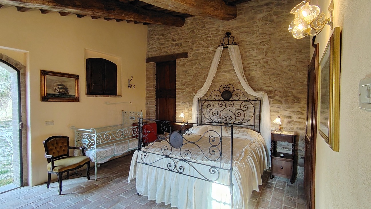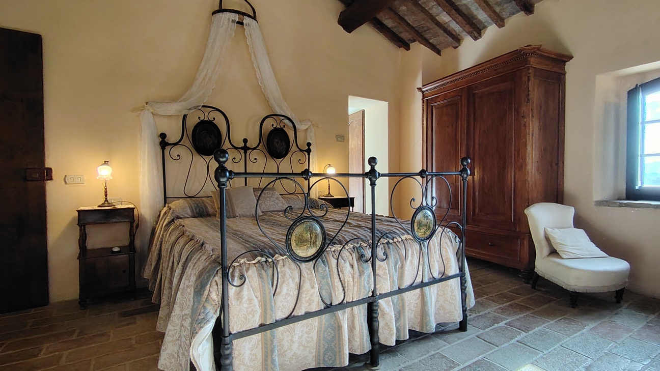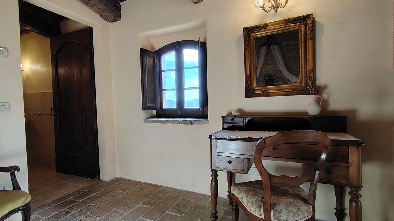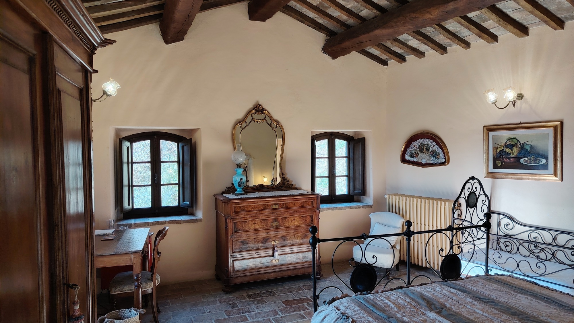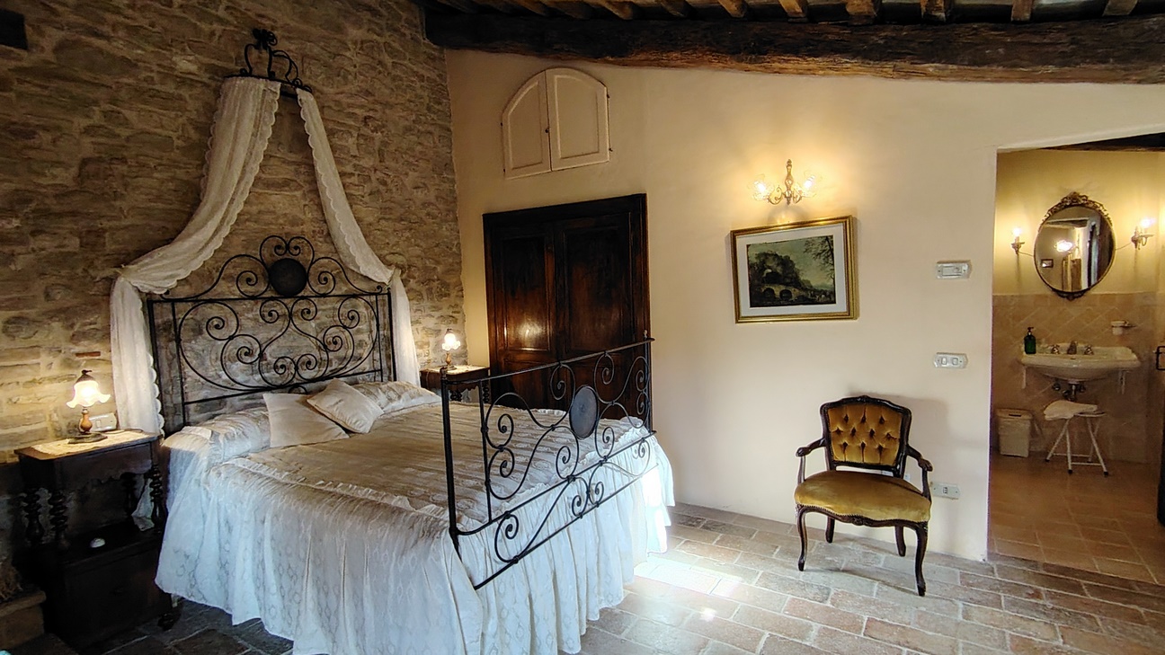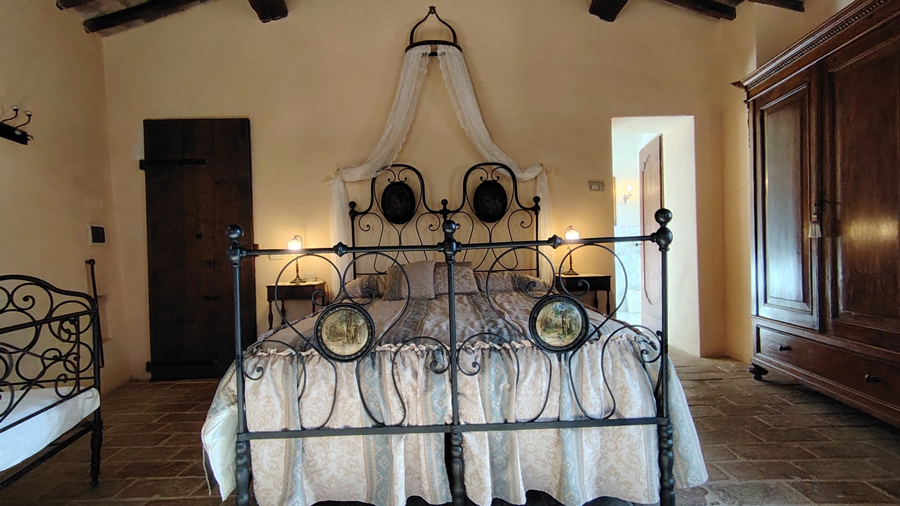 Dimora Dorata, ampia camera superiore matrimoniale, arredata con mobilio di fine antiquariato: al centro un raro letto papalino settecentesco, scrivania intagliata e armadio stile impero. E’ la più grande del borgo e le sue panoramiche finestre spaziano in diverse direzioni sulle colline del Montefeltro. Confortevole ed in posizione dominante tra gli edifici del borgo, offre la possibilità di alloggiare, all’occorrenza, almeno un letto supplementare.