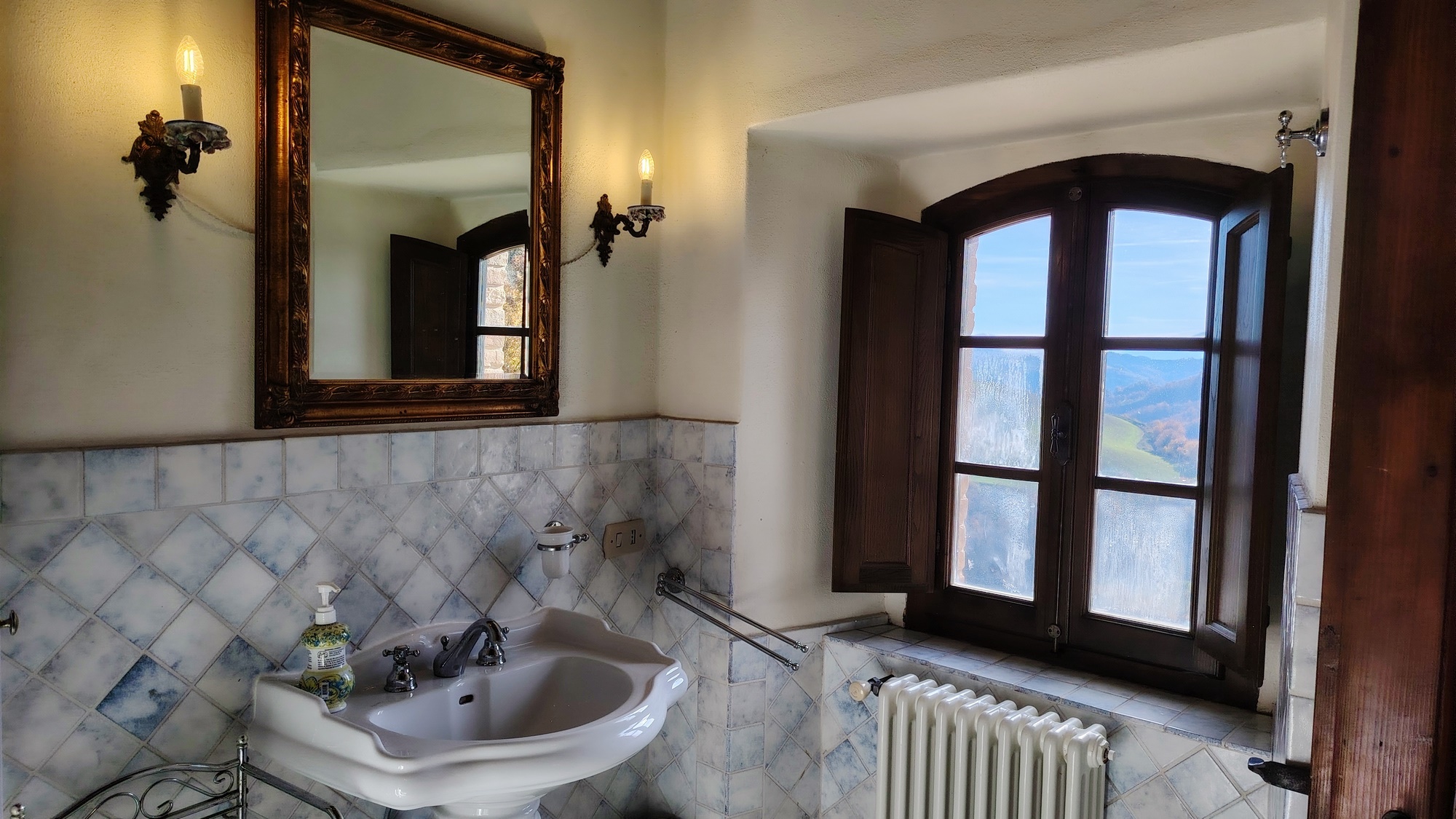 Dimora dei Cuori, bella camera Superiore matrimoniale panoramica, arredata con mobilio metà ’800. La posizione dominante e le finestre che guardano sul panorama collinare del Montefeltro la rendono particolarmente luminosa e pregevole. Anche il bagno dispone di una finestra con vista panoramica.